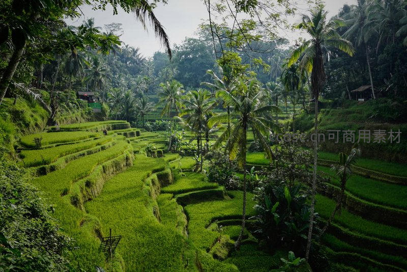 被高大椰树环绕的梯田层层叠叠,充满生机,仿佛置身于世外桃源般的热带田园画卷中。