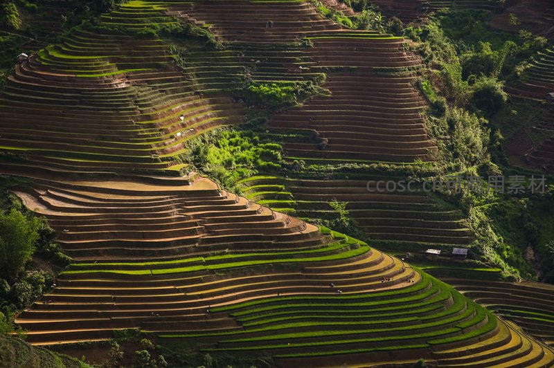 夕阳斜照下的梯田呈现出金黄与翠绿交织的层次感,蜿蜒的线条勾勒出大地的艺术之美。