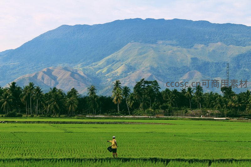 一位农夫行走在广阔无垠的绿色稻田中,背景是苍翠山峦和椰林,传递出质朴而宁静的田园生活气息。