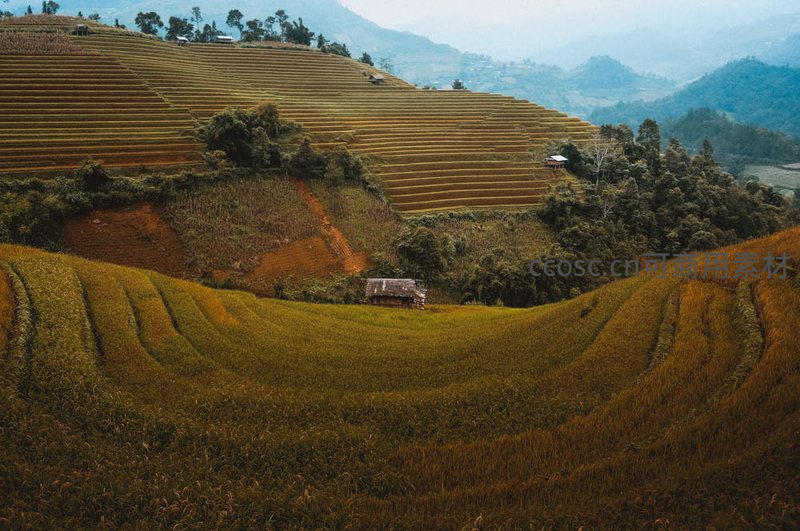 连绵起伏的梯田披上金黄外衣,在群山环抱中延伸至远方,几座小屋点缀其间,预示着一个丰饶的秋日季节。