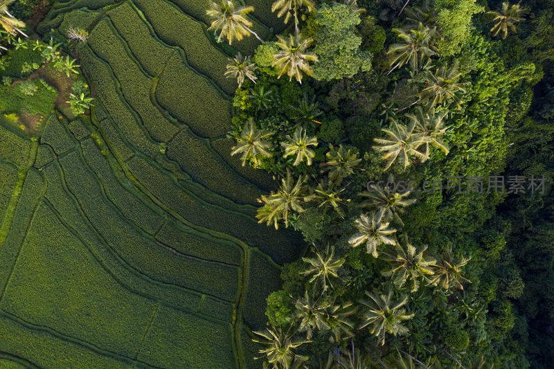 从高空俯瞰,规整的梯田与茂密的热带雨林无缝衔接,棕榈树点缀其间,展现大地艺术与自然生态的完美融合。