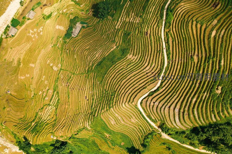 无人机镜头下,梯田如波浪般起伏,蜿蜒小路穿梭其间,构成大地上的抽象乐章,展现人类智慧与自然的和谐共生。