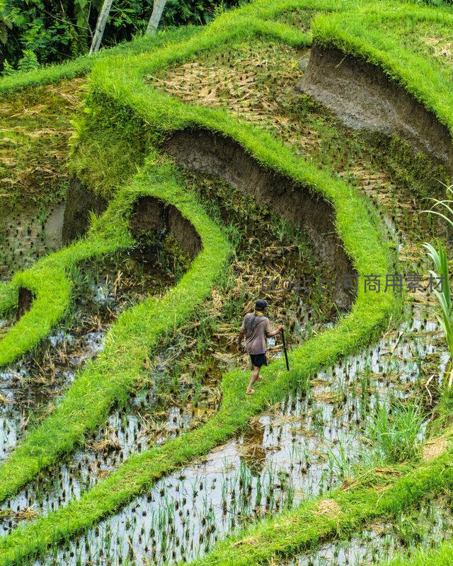 一位农夫赤脚行走在蜿蜒的梯田埂上,手持工具,专注地照料着这片充满生机的绿色稻田。
