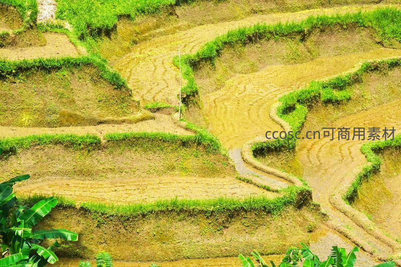 成熟的稻谷染黄了层层梯田,在阳光下泛着金色波浪,展现出大地艺术般的优美曲线和丰收景象。