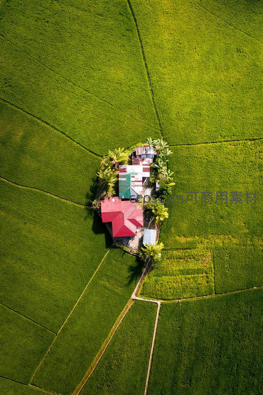 从高空俯瞰,几座红顶房屋被无垠的翠绿稻田环抱,宛如镶嵌在绿色地毯上的彩色宝石,宁静而美丽。