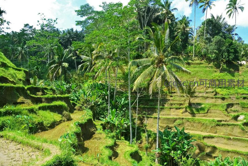 阳光洒落在起伏的梯田上,高大的棕榈树挺立其中,绿意盎然的景象展现了热带地区独特的农业景观与生态魅力。