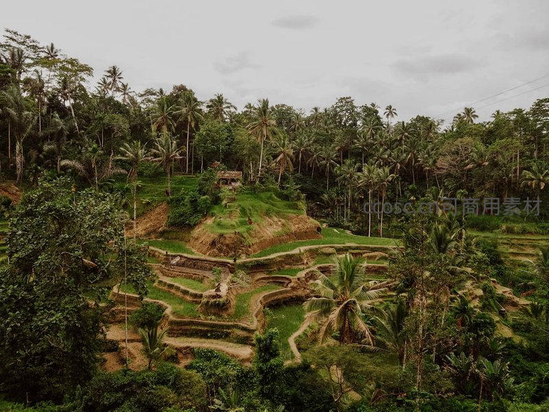 层叠的梯田镶嵌在郁郁葱葱的热带雨林中,棕榈树与绿植环绕,展现人与自然和谐共生的田园画卷。
