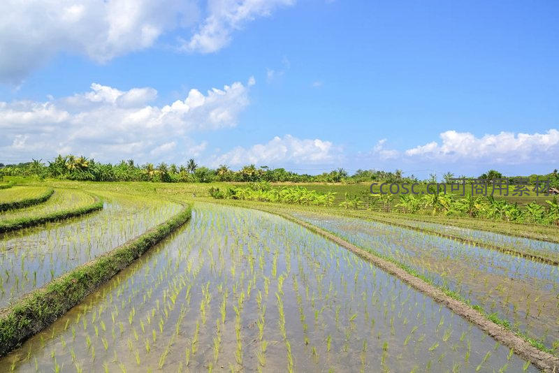 清澈的水田中嫩绿秧苗初生,蓝天白云倒映水面,微风轻拂,展现出充满生机与希望的农耕新景象。