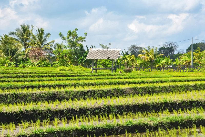 青翠的梯田层层铺展,一座简朴小亭静立其间,背景是蓝天与热带植被,营造出悠闲恬淡的田园生活氛围。