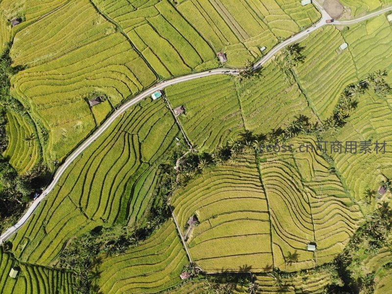 从空中俯视,大片翠绿的梯田如同大地的指纹,蜿蜒的道路穿梭其间,展现自然与人工的和谐之美。