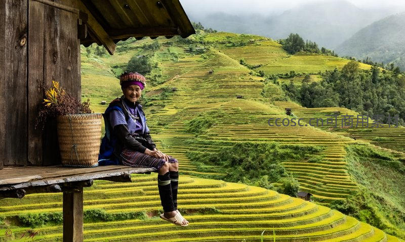 一位身着传统民族服饰的老妇人静坐于木屋前,身后是金黄起伏的梯田与缭绕云雾,展现人与自然和谐共处的诗意生活。