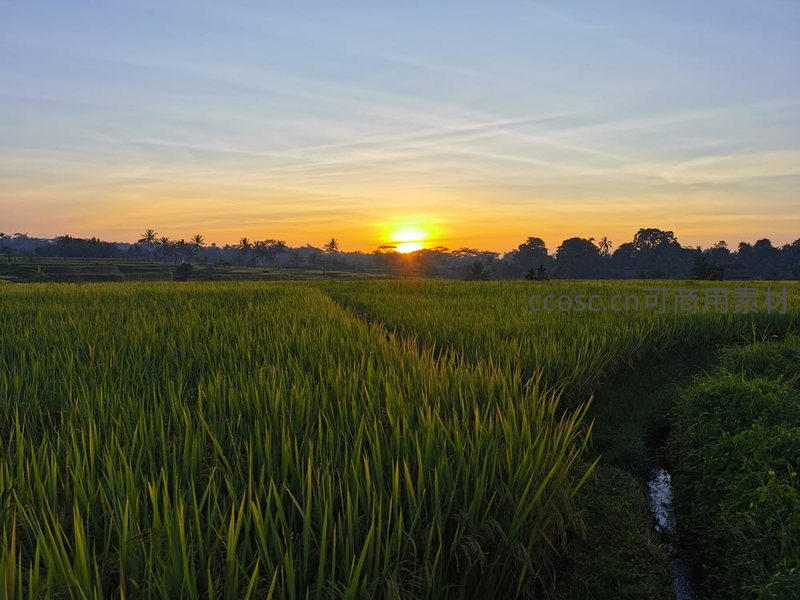夕阳西下,金色的阳光倾泻在广袤的稻田上,稻穗随风轻摇,远处树影朦胧,营造出温暖而宁静的黄昏田园意境。