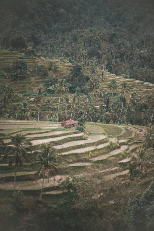 层叠的梯田依山而建,棕榈树点缀其间,一座小屋隐于绿意之中,展现人与自然和谐共处的田园画卷。