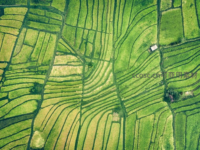 从高空俯瞰,层层叠叠的稻田形成优美的曲线与几何图案,绿意盎然,宛如大地精心绘制的艺术画布。