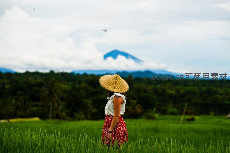 身着红裙、头戴斗笠的少女伫立在翠绿的稻田中,凝望远方云雾缭绕的青黛色山峦,画面充满诗意与宁静。