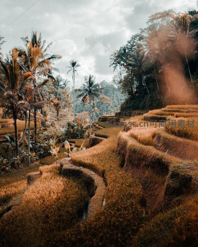 金黄色的稻浪铺满山坡梯田,高大的棕榈树在微风中摇曳,远处薄雾弥漫,营造出温暖而静谧的丰收景象。