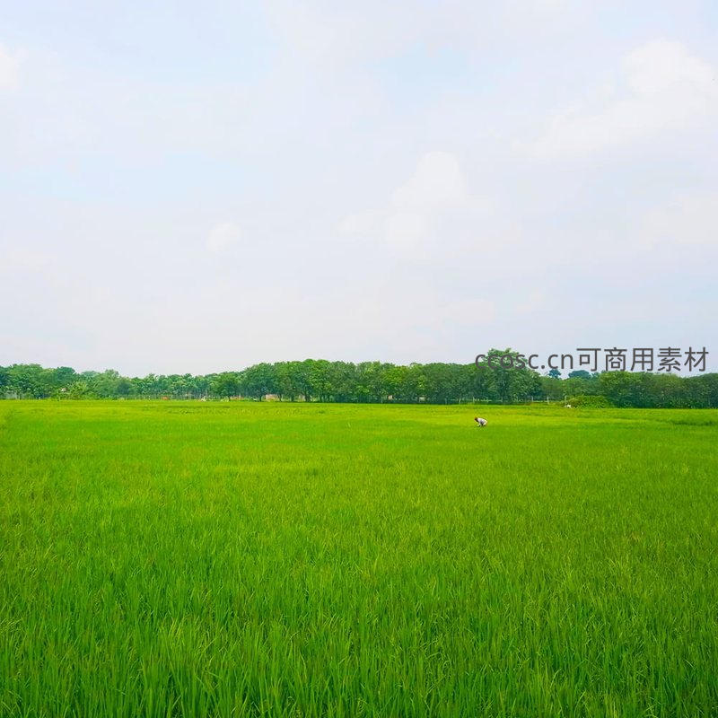 一望无际的翠绿稻田延伸至天际,一只白鹭悠闲地在田间觅食,蓝天白云下构成一幅宁静祥和、充满生命力的田园风光图。