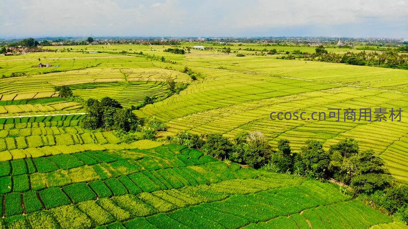 高空视角下,大片稻田如大地织锦,不同成熟度的绿色与黄色块面交织,勾勒出壮丽的农业景观,展现丰收前的勃勃生机。