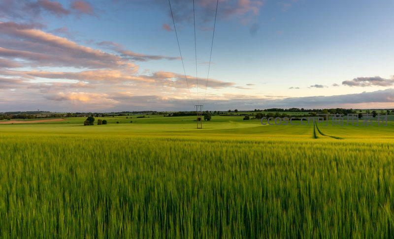 金色夕阳洒在无垠的绿色麦田上,远处山峦起伏,天空云霞绚烂,构成一幅宁静祥和的田园画卷。