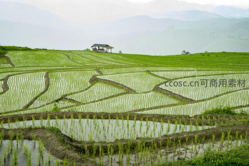 层层叠叠的梯田如镜面般倒映着天空,远处青山被薄雾笼罩,田埂间的小亭静立,尽显东方田园诗意。