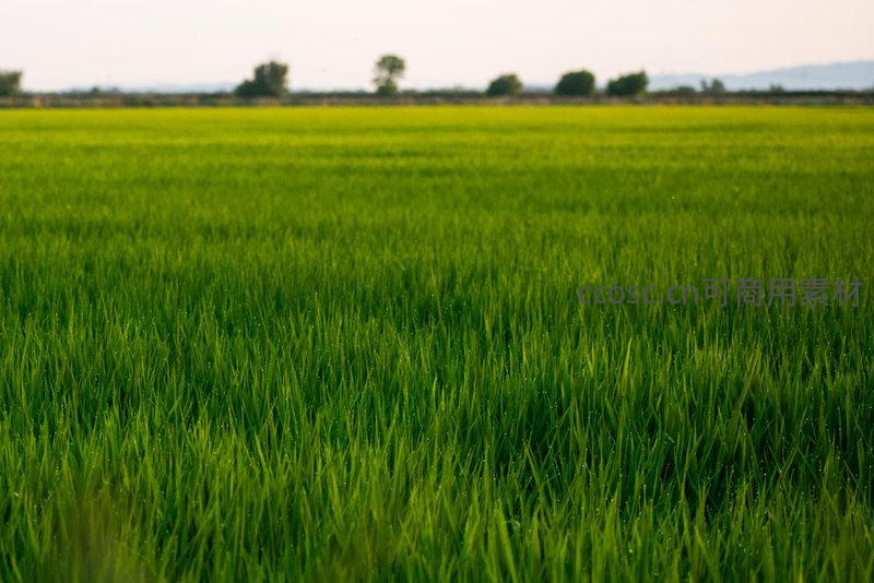 无边无际的翠绿稻田在阳光下泛着光泽,远处树木点缀天际,空气仿佛都弥漫着青草与泥土的芬芳。