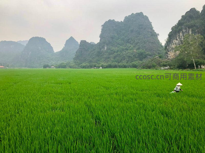广袤绿野中,一位戴斗笠的农人辛勤劳作,背景是雄伟的喀斯特山峰,充满诗意与力量。