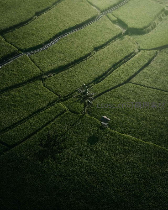 从高空俯瞰,层层叠叠的翠绿梯田如大地的指纹,一棵孤树与小屋点缀其间,光影交错,展现宁静而壮丽的田园诗画。