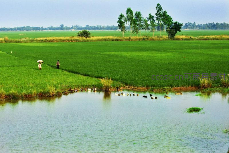 碧绿的稻田与清澈的水塘相接,一群鸭子在水中悠游,远处两位农人沿田埂缓行,构成一幅生机勃勃、人与自然和谐共处的田园画卷。