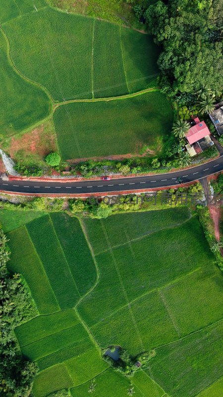 一条黑色的柏油路如丝带般蜿蜒穿过广袤的绿色稻田,路边点缀着几栋红顶房屋和茂密树林,展现了现代交通与传统田园风光的和谐交融。