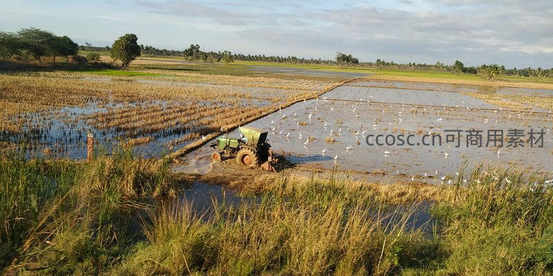 绿色拖拉机在水田中作业,成群白鹭在旁觅食,构成一幅人与自然和谐共生的田园画卷。