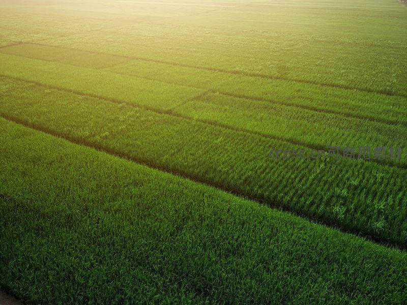 航拍视角下,金色阳光温柔地洒在层层叠叠的翠绿稻田上,光影交织,宛如一幅宁静的大地油画。