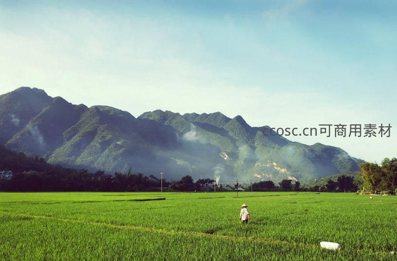 一位戴着草帽的农夫独自走在广袤的绿色稻田中,身后是苍翠如黛的远山,画面充满诗意与宁静。