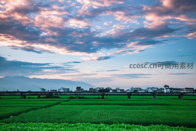 绚丽晚霞染红天际,绿油油的田野与远处白墙黛瓦的村庄相映成趣,构成一幅宁静诗意的田园画卷。