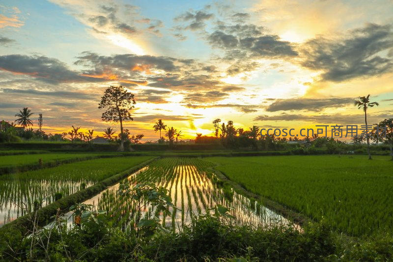 金色夕阳倾泻而下,水田如镜面般倒映着绚烂天光与椰林剪影,营造出温暖宁静的热带田园意境。