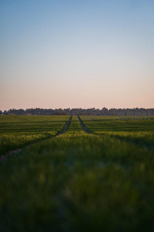 暮色渐浓,笔直的田埂划破广袤的绿色田野,一直延伸至远方的森林边缘,画面开阔而宁静。