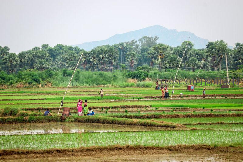 青山环绕下,农民在层层叠叠的水田中辛勤劳作,展现人与自然和谐共生的田园画卷。