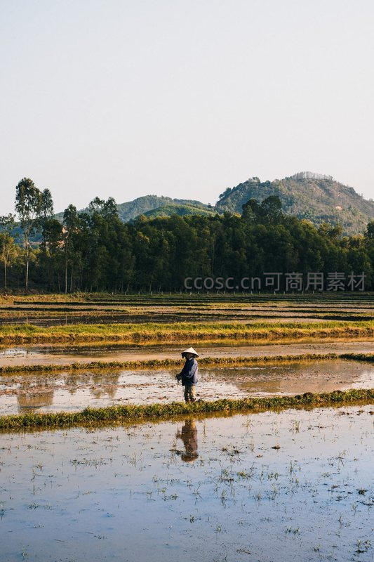 一位戴斗笠的农夫独自走在水光潋滟的稻田间,身后是苍翠山林,画面静谧而充满诗意。