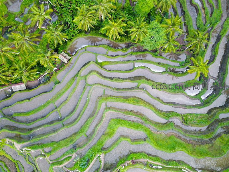 从高空俯瞰,如丝带般蜿蜒的梯田与热带棕榈林交织,构成一幅令人惊叹的大地艺术图景。