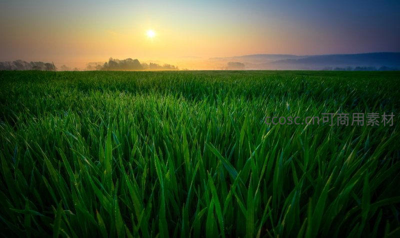 朝阳初升,金色光芒洒满广袤无垠的绿色麦田,薄雾弥漫,营造出宁静而充满希望的清晨景象。
