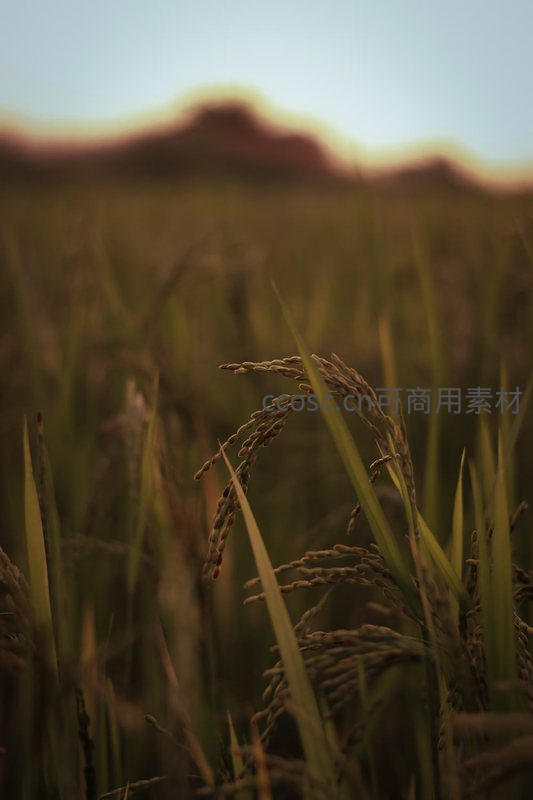 夕阳余晖染金穗,微距特写稻谷丰盈