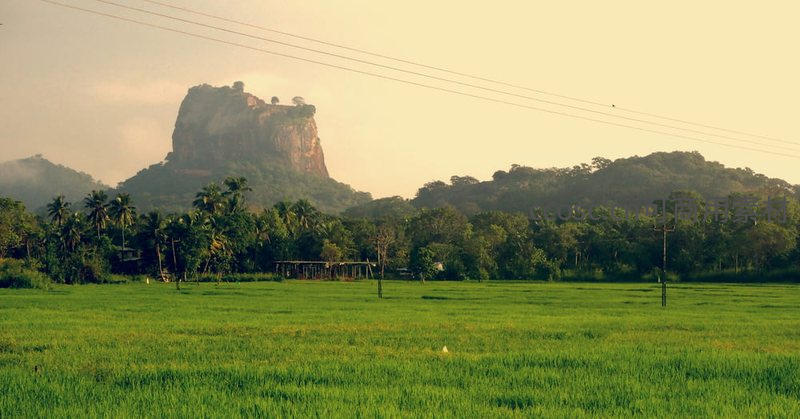远处雄伟的岩石山峰在夕阳下轮廓分明,前方是平坦的绿色稻田,电线横跨其间,展现自然与人文交织的壮丽景象。