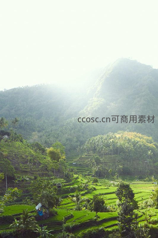 清晨的薄雾轻柔地笼罩着青翠的山峦,阳光穿透云层洒向层层叠叠的梯田,宛如仙境般的田园风光令人陶醉。