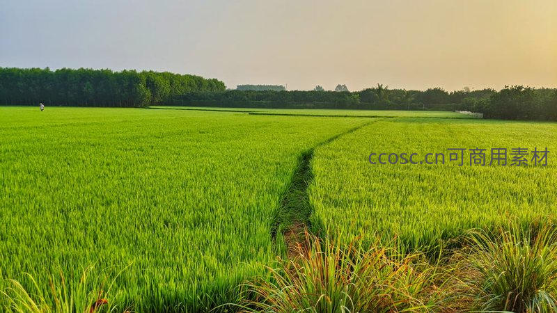 一条蜿蜒的小径将无垠的绿色稻田一分为二,夕阳的金辉温柔地洒满大地,近处的野草随风摇曳,尽显田园诗意。