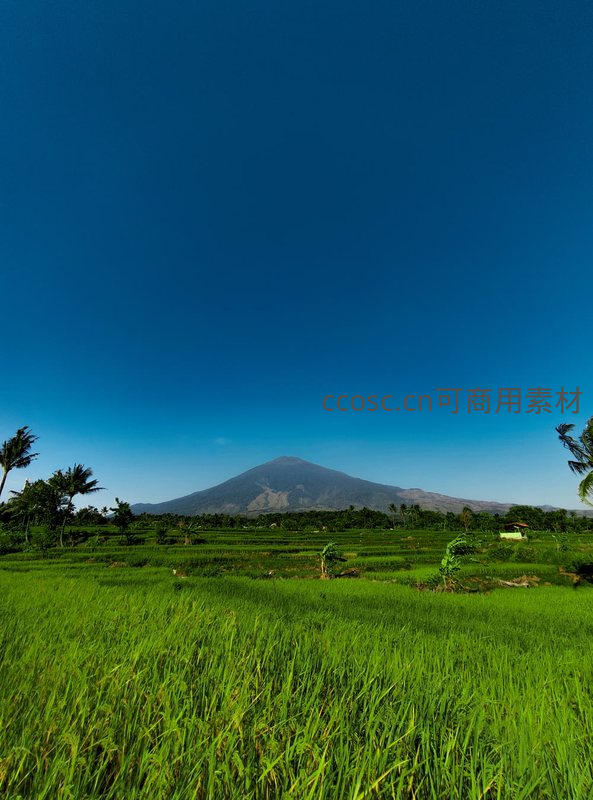 广阔无垠的碧绿稻田在蔚蓝天空下铺展,远处雄伟的火山静默矗立,构成一幅和谐宁静的田园诗画。