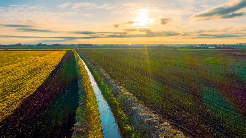 清晨阳光下,一条清澈水渠如银线般将色彩斑斓的农田一分为二,一边是金黄,一边是深绿,构成一幅充满韵律的几何田园画。