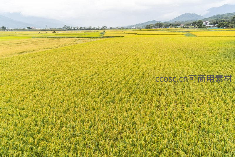 金秋时节,大片成熟的稻田在阳光下泛起金色波浪,一望无际,远处青山如黛,展现出一派丰收在望、富饶祥和的田园风光。