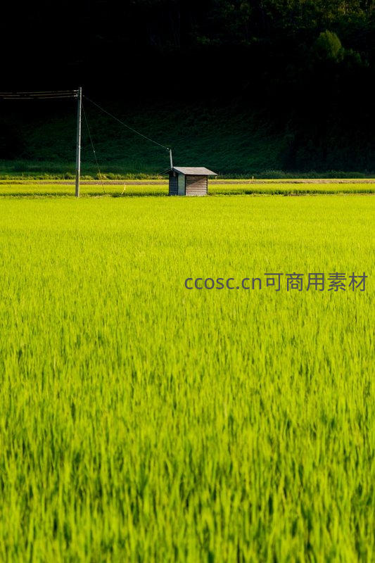 广阔稻田中孤独小屋与电线杆