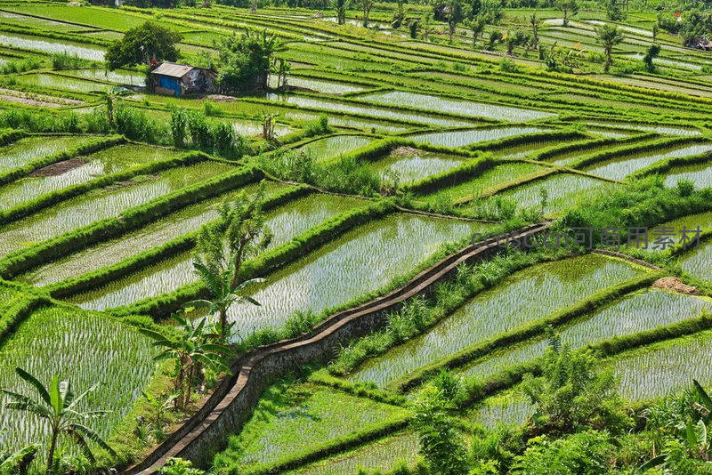 在明媚阳光下,纵横交错的灌溉水渠将梯田分割成规整的几何图案,水光潋滟,绿意盎然,展现出精妙的人工与自然和谐之美。
