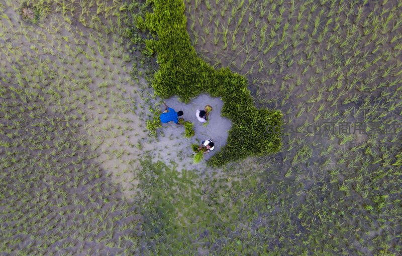 俯瞰农人插秧劳作的瞬间
