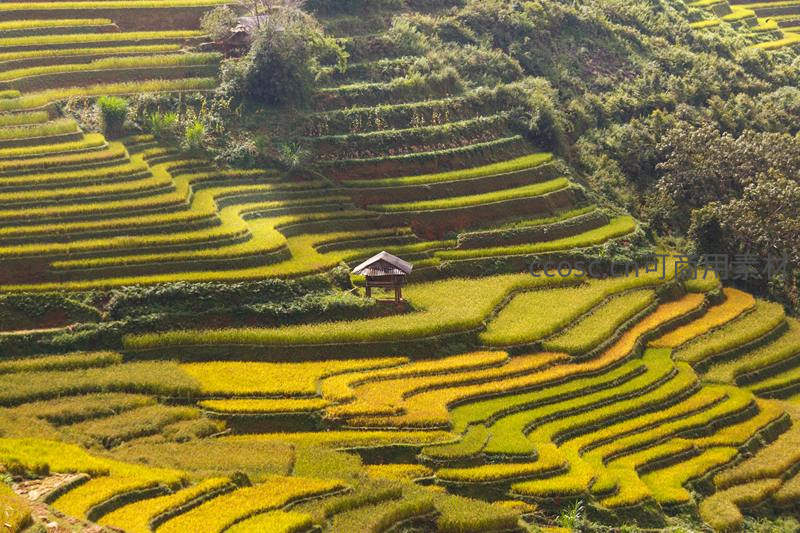 金色梯田上的小亭子静谧如画